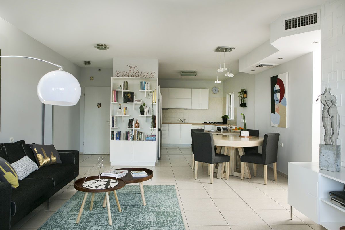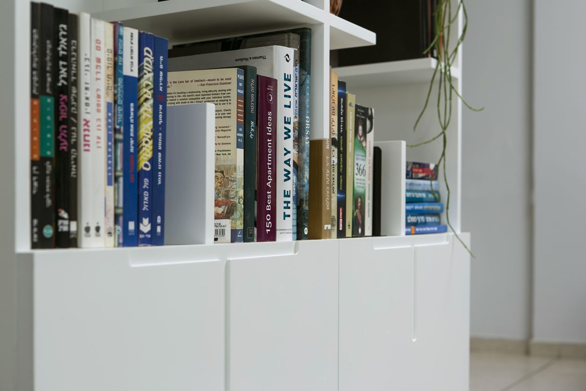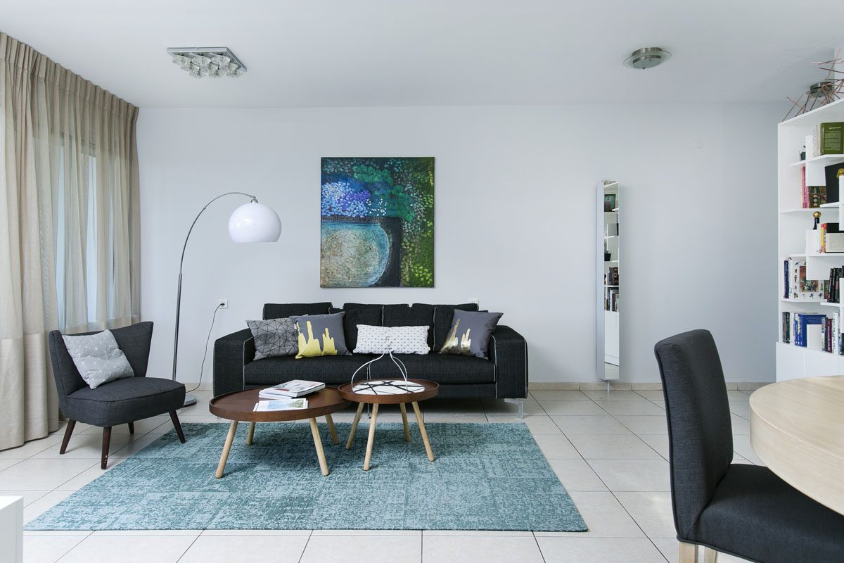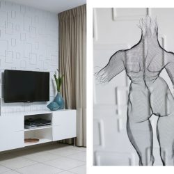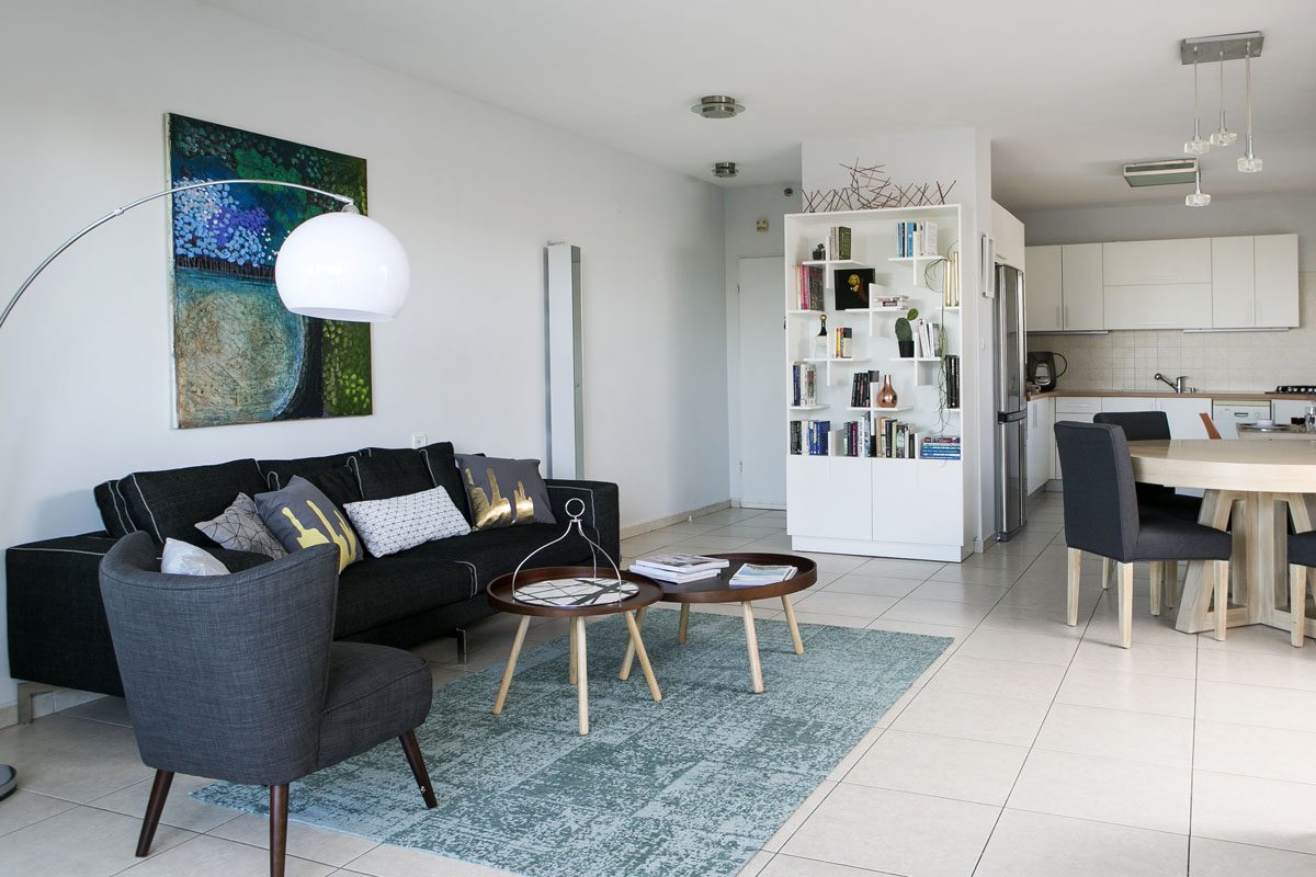 עיצוב והלבשת החלל הציבורי בדירה, עבור זוג – ספרנית ומהנדס. כולל תכנון פריטי נגרות ייחודיים, חיפויי הקירות, הריהוט, פריטי האמנות והאביזרים להשלמת המראה הנעים והאלגנטי של הדירה.