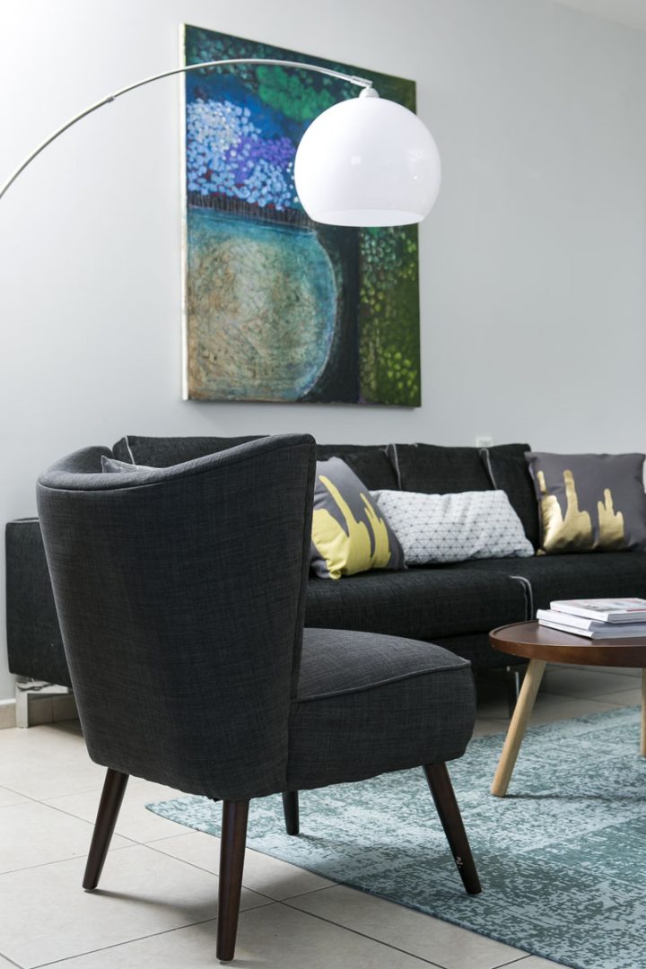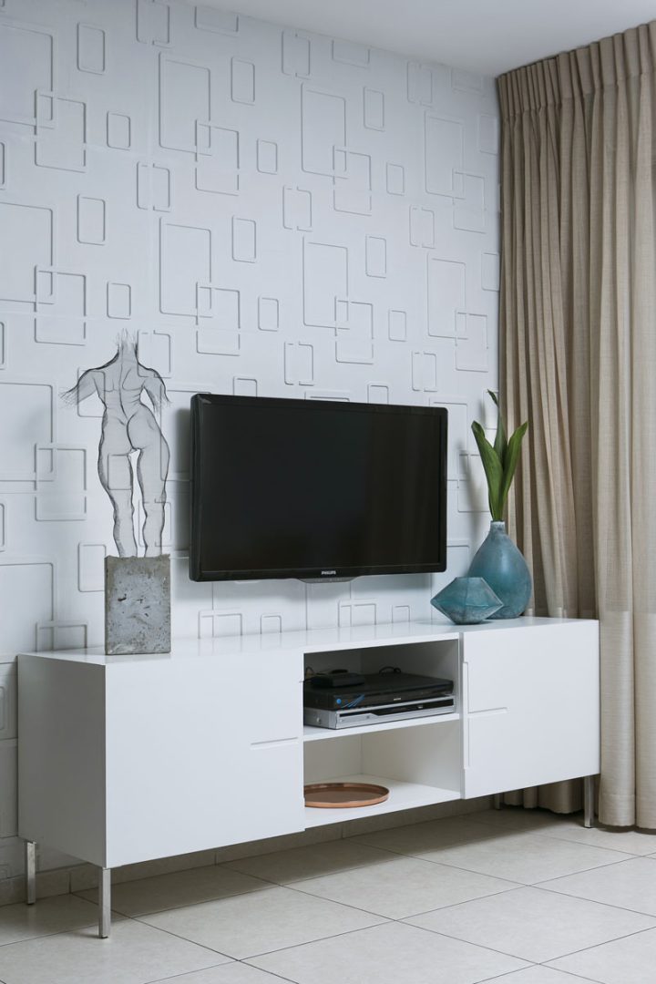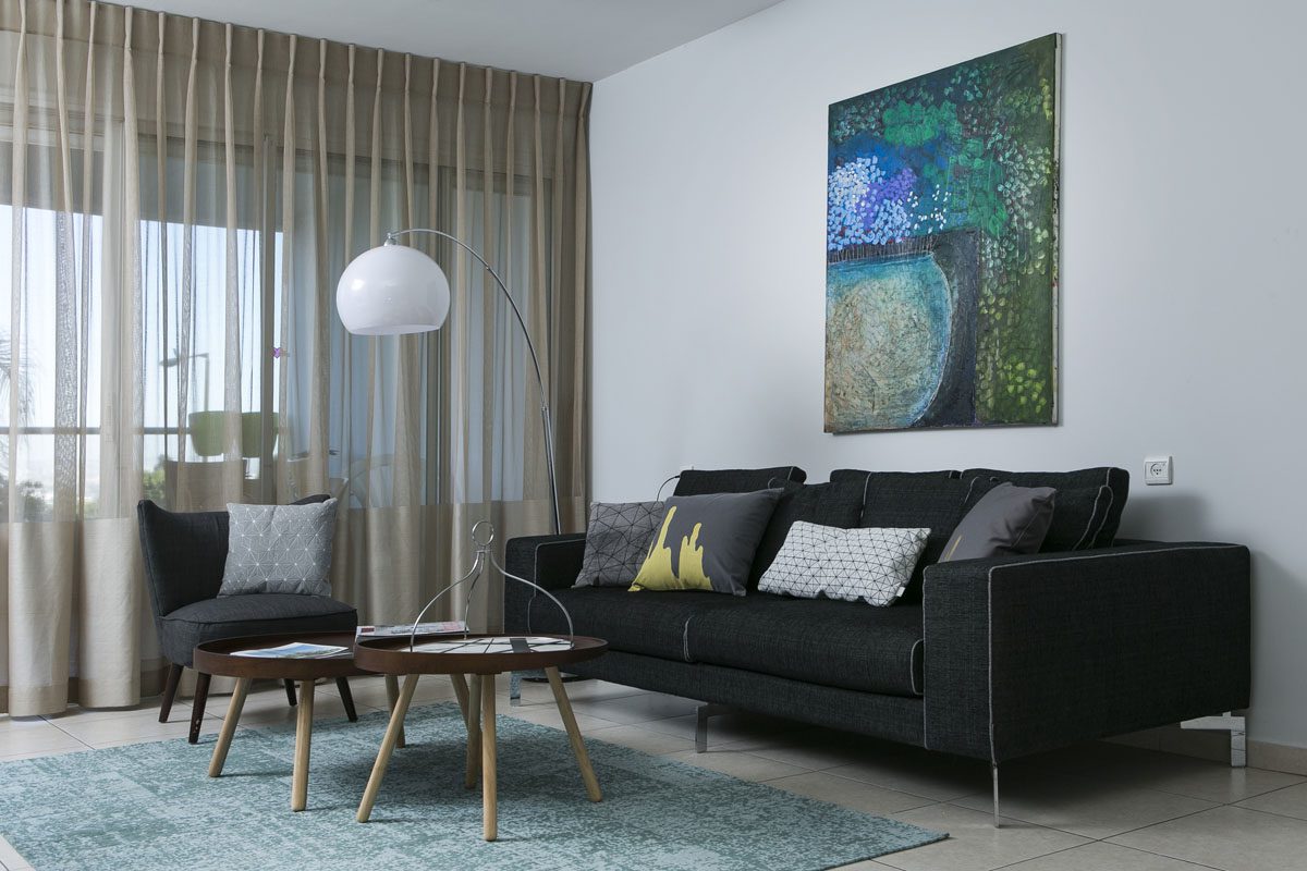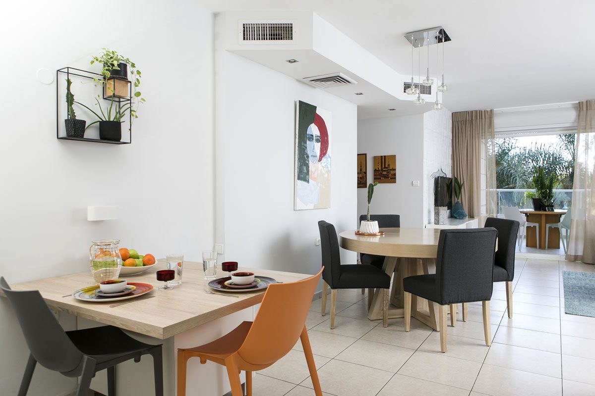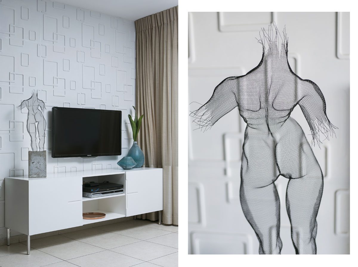 עיצוב והלבשת החלל הציבורי בדירה, עבור זוג – ספרנית ומהנדס. כולל תכנון פריטי נגרות ייחודיים, חיפויי הקירות, הריהוט, פריטי האמנות והאביזרים להשלמת המראה הנעים והאלגנטי של הדירה.